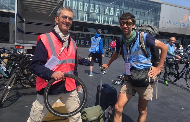 Jeudi 8 juin, plusieurs bibliothécaires à vélo ont déchargé leurs affaires devant le Palais des congrès de Dunkerque, qui accueille le 68e Congrès de l’Association des Bibliothécaires de France (ABF), 3 jours durant. « La bibliothèque est le véhicule informationnel de demain ! », se plaît à transposer l’un des biblio-cyclistes, Jean-Marie Feurtet, qui travaille à l’Abes. C’est son premier congrès de l’ABF, il vient d’entrer à la commission verte de l’association et tient un stand sur le sujet de l’écologie. « On espère que le prochain congrès portera davantage sur ce thème », glisse-t-il.