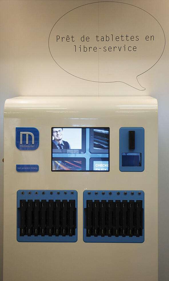 Le fournisseur Nedap a dévoilé pour la première fois lors du congrès de l’ABF son nouvel automate dédié aux tablettes numériques. Ce distributeur peut contenir 16 iPad. L’usager utilise sa carte de lecteur pour déverrouiller et emprunter une tablette, idem pour la rendre. Une fois replacée dans l’automate, la tablette est vidée des contenus téléchargés par le dernier emprunteur et se trouve de nouveau disponible. Alors que le prêt de tablettes se multiplie dans les bibliothèques, ce nouveau système a retenu l’attention de nombreux congressistes.