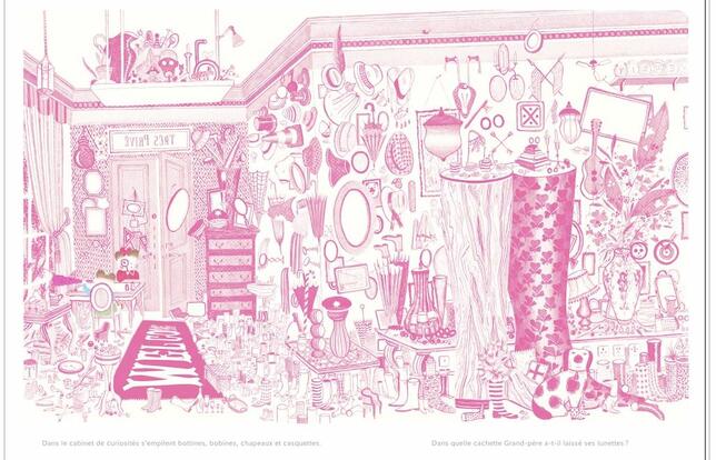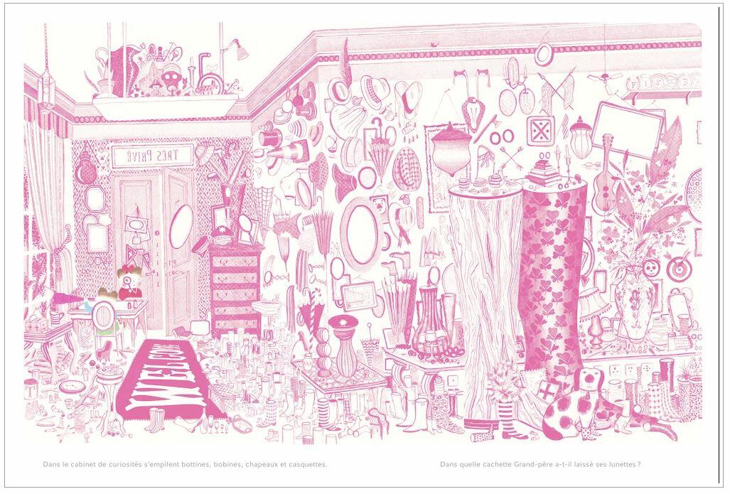 Les enfants sont prêts pour aller au parc. Grand-père aussi. Enfin presque... Il ne lui reste plus qu'à trouver ses chaussettes, ses lunettes, son parapluie, et même ses... dents ! Les enfants compatissent et se mettent en quête de tous les objets égarés par l'aïeul distrait. De quoi s'arracher les cheveux, car dans le manoir de Grand-père chaque pièce croule sous un bazar insensé de bibelots, portraits, vases, tasses, décorations, ustensiles en tout genre. Sans compter que la couleur de l'objet recherché est justement celle de la pièce où il se trouve. L'auguste manoir est en effet doté de pièces peintes d'une couleur originale acidulée : mauve, rose, orange. Un exemple : Grand-père est sûr d'avoir perdu son dentier jaune dans la salle de bain. Or celle-ci - ironie du sort - est comme par hasard d'une belle couleur jaune canari ! Si la quête relève parfois de la mission impossible, elle est cependant toujours amusante car l'œil se perd avec délice dans le détail des innombrables objets qui encombrent les pièces surannées, certes, mais dynamisées par le monochrome pop de la peinture. La chasse à l'objet recèle aussi quelques savoureuses surprises. Ainsi, dans la salle de bain, Grand-père a entreposé son matériel de pêche : épuisettes, pagaie, ancre, panier à pêche, etc. Et dans le cabinet de dessin, il a entassé des dizaines de galoches ! Bref, Papi a un sens du rangement très personnel... On adore ce livre qui fera aussi la joie des parents. Pas sûr qu'ils soient aussi fins limiers que leur progéniture !
