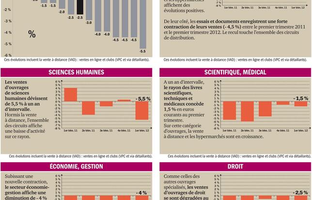 Au premier trimestre 2012, où les ventes de livres en valeur se sont globalement contractées de 2,5 % par rapport à la même période de l'année précédente, aucun rayon ne progresse mais sept secteurs se placent au-dessus de la moyenne du marché. C'est le cas des livres pratiques et du poche, stables à un an d'intervalle ; des BD et mangas, qui se contractent de 1 % ; des livres scientifiques, techniques et médicaux et de la littérature de fiction, qui cèdent 1,5 % ; et, enfin, des ouvrages pour la jeunesse (- 2 %). A - 2,5 %, les livres juridiques évoluent au rythme moyen du marché.
