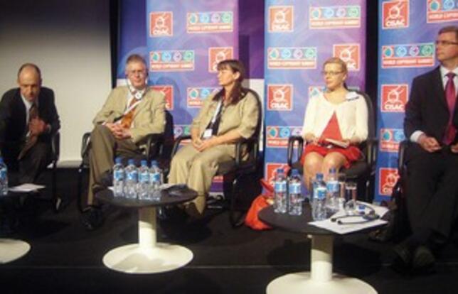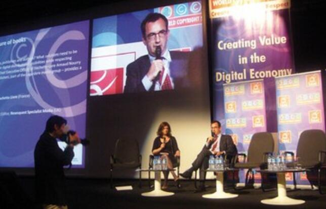 Les représentants des diverses sociétés d'auteur sont aussi invoqué cette diversité culturelle pour défendre leurs organisations, qui reposent sur des monopoles nationaux que la Commission remet en cause. Ils ont aussi rappelé que la culture, c'est du sérieux : au milieu de la crise financière de 2009, le secteur a continué à embaucher, et a bien mieux résisté que l'industrie, a rappelé Philippe Kern, consultant spécialisé dans l'économie du secteur. Tous se sont entendus pour estimer que les fournisseurs d'accès à Internet (FAI), grands profiteurs des contenus culturels dont ils facilitent la diffusion piratée, devraient être enfin mis à contribution, ainsi que l'a brillamment démontré David Touve, jeune professeur d'économie. Ces FAI et autres groupes internationaux de télécoms militent en effet pour ces licences globales qui inquiètent les producteurs de musique et d'audiovisuel, et profiteraient aussi aux géants américains des nouvelles technologies : Amazon, Apple et autres Google - ce dernier étant sponsor du sommet, qu'il a soutenu financièrement.