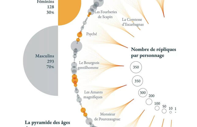 La datavisualisation peut renouveler le champ de la biographie. « Je venais de refuser un projet sur Molière », se souvient Jean-Baptiste Bourrat, éditeur aux Arènes de L'atlas Molière (janvier 2022). Mais quand Clara Dealberto, Jules Grandin et Christophe Schuwey prennent contact avec lui pour lui soumettre « cette idée peut-être un peu folle », il est immédiatement séduit. Le pitch ? Retracer la vie et l'œuvre de Molière sous forme de cartes et d'infographies. « Ces trois auteurs ont des compétences littéraires et infographiques. En une image ou une carte, ils sont capables de synthétiser une somme phénoménale de savoirs qui dormaient dans des rapports de thèse ou des études scientifiques », s'enthousiasme l'éditeur. Quelques mois auparavant, Dorothée Cunéo, directrice de Denoël, a ouvert le bal des biographies infographiques avec Le proustographe : Proust et À la recherche du temps perdu en infographie de Nicolas Ragonneau avec les infographies de Nicolas Beaujouan. Auteur, éditeur et proustomane notoire - il anime le blog Proustonomics - Nicolas Ragonneau lui soumet initialement un manuscrit dans lequel se baladent de nombreuses données. « Je l'ai rejeté en lui proposant de créer un champ de données que j'ai ensuite transmis à Nicolas Beaujouan, avec qui j'avais déjà collaboré pour Geek [paru en 2013 chez Robert Laffont, ndlr] », raconte Dorothée Cunéo. Surprenants, ces deux ouvrages ont été très remarqués. Le premier, l'Atlas Molière, a bénéficié d'une belle couverture presse, de France Inter au Monde en passant par Le Figaro ou encore Mediapart, quand le second, Le proustographe, qui « s'exporte bien », a notamment reçu, dans le cadre des Trophées de l'édition organisés par Livres Hebdo, le Trophée de la conception artistique 2021.