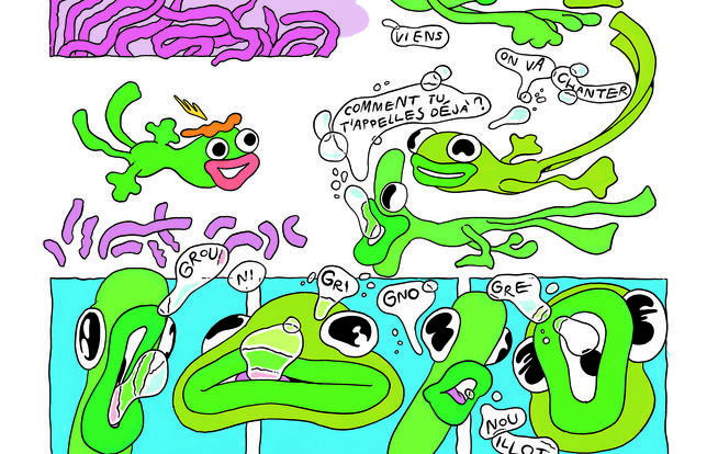 Dans Ballades, son premier album, Camille Potte ne se contente pas de dépoussiérer les contes façon post #MeToo. Elle s'en gausse, les mélange, tord et hache menu leurs stéréotypes. Ici, pas de valeureux prince, pas de princesse enamourée, mais des femmes fortes déterminées à vivre leur vie comme elles l'entendent. Au passage, l'autrice démolit toujours dans la bonne humeur quelques clichés contemporains (sur la reconversion professionnelle par exemple) et évoque l'air de rien des sujets d'actualité : féminisme, émancipation, démocratie, pouvoir... Pour servir son propos sans lourdeur, elle a créé un monde cartoonesque mi-médiéval, mi-fantasy, aux décors psychédéliques, au trait élastique et aux couleurs pop, très seventies - en voyant ses irrésistibles batraciens musiciens, impossible de ne pas penser à la grenouille du clip Love Is All de Roger Glover (1974) qui meublait les temps morts d'Antenne 2... Son récit hilarant, par ailleurs très bien construit, rythmé par le chœur des grenouilles et mené tambour battant avec rebondissements et retournements de situation, doit également beaucoup à la langue dans laquelle s'expriment les personnages, un savant et désopilant mélange de langage parlé d'aujourd'hui et de sabir pseudo-médiéval. Ici, un burn-out devient une « outrebrûlade » ; là, la chevalière menace des importuns d'un « Vous les deux testes de crotaille, esbignez-vous vite fait ou je vous desfonce ». Rares sont les albums où la malice et l'imagination de l'auteur imprègnent à parts égales l'esthétique et les dialogues pour créer un univers aussi loufoque que cohérent.