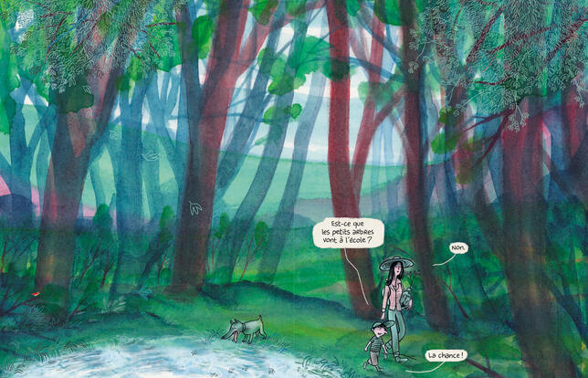 Une fois encore la mère sait trouver les mots pour le consoler, lui expliquant qu'un arbre n'est jamais vraiment seul et que la forêt est un peu comme sa famille. Pour sa première incursion en solo dans l'album jeunesse, le dessinateur et scénariste BD Charles Berberian fait mouche. Sa déclaration d'amour aux forêts est émaillée de dialogues vibrant de sensibilité, mais aussi d'humour et de répartie. Le thème de la mort est ici abordé avec délicatesse. Dans une ville un homme meurt, mais dans une forêt un arbre naît, grandit et vit. Une leçon d'optimisme exaltée par la qualité de l'illustration. La forêt selon Berberian est proprement prodigieuse, nimbée d'une incroyable lumière où la palette des bleus verts le dispute à celle des mauves pourpres.