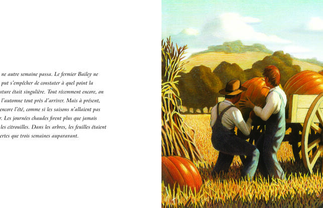 C'est l'été, le soleil dans le ciel est insolent. Heureux, le fermier Bailey siffle dans son camion, quand soudain un gros bruit se fait entendre. Il aura heurté un chevreuil ? Surprise, c'est un homme qui gît à terre, inconscient... Aussitôt il lui porte secours et le ramène à la maison. Bizarre, quand Bailey prête des habits propres au blessé, celui-ci ne sait pas quoi faire des boutons et de la boutonnière... Appelé à la rescousse, le médecin conclut à une amnésie causée par l'accident. Katy, la petite fille de Bailey, l'observe et note des choses bizarres. Ainsi les deux lapins du pré, à la vue de l'homme, ne s'enfuient pas mais courent vers lui. De même, il est comme hypnotisé par les oies sauvages qui passent haut dans le ciel. Bailey constate de son côté que quelque chose ne tourne pas rond dans la météo depuis qu'il a recueilli l'inconnu. Alors qu'on devrait être en automne, les citrouilles continuent de grossir et les feuilles sont toujours vertes autour de la ferme. L'été semble vouloir durer encore et encore. Un soir, en montant sur une colline, l'homme constate que tous les arbres plus au nord sont déjà tous orangés. Étrange... Dans cette fable qui peut aussi se lire comme une allégorie, le conteur américain multiprimé Chris van Allsburg ne lève jamais le mystère sur les origines énigmatiques de son personnage. Au fil des pages, on est aussi happé par le trait des crayons de couleur, solaire, réaliste mais toujours nimbé d'une légère impression d'irréel présente d'un bout à l'autre de l'album.