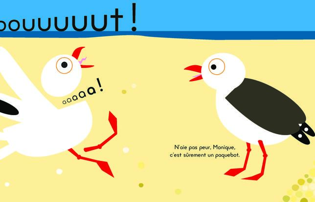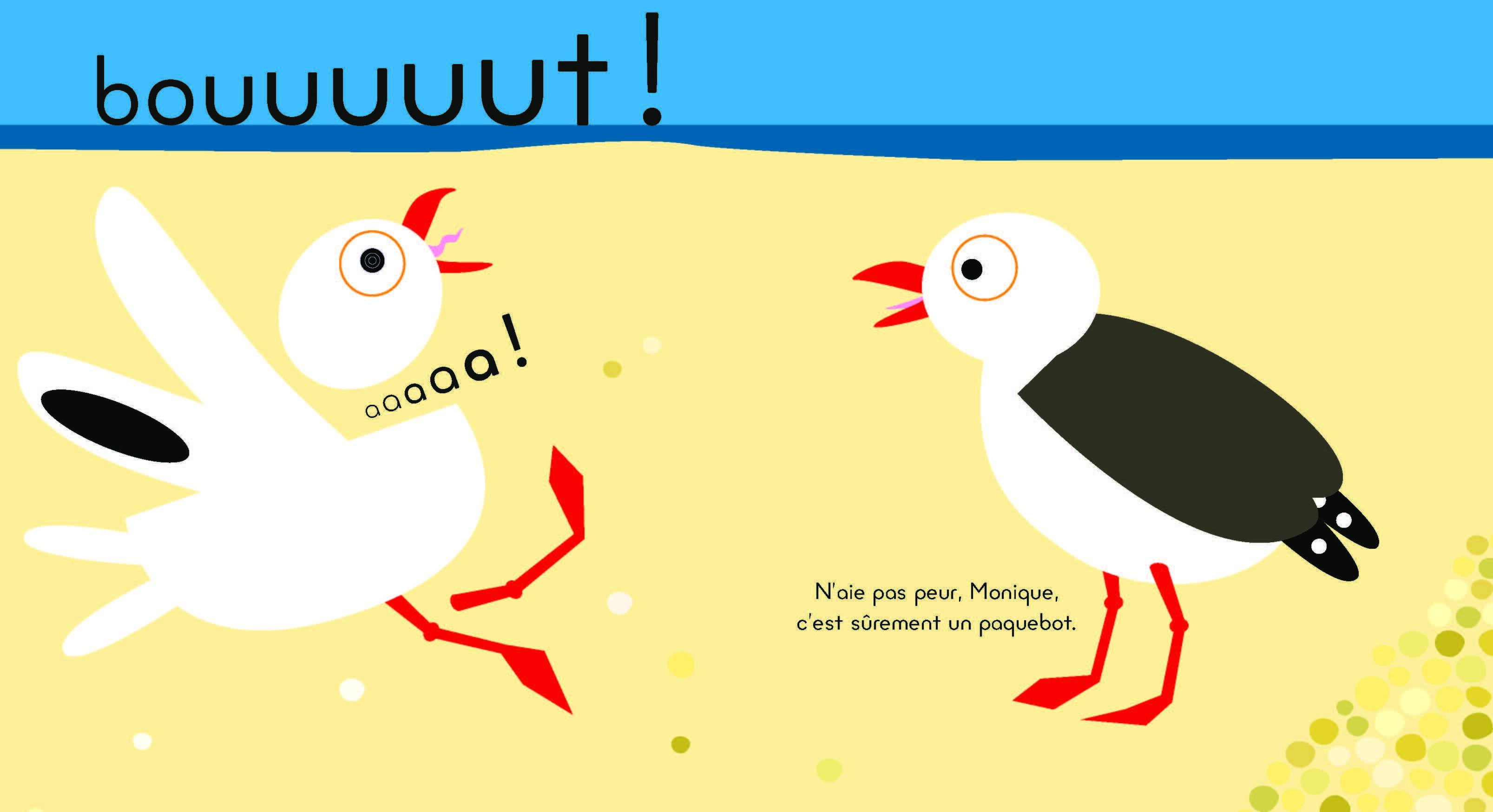 Sous le regard des mouettes. Monique et Michel, mouettes de leur état, n'ont rien d'autre à faire de la sainte journée que compter les grains de sable sur leur plage. Si le compte de Michel est bon, celui de Monique est beaucoup plus aléatoire... Plus fragile, Monique est aussi plus poltronne. Aussi, quand retentit un long BOUUUUUT venu du grand large, sursaute-t-elle de peur. Michel la rassure : la saison commence, c'est sûrement un paquebot. De leur côté, les mouettes Mokhtar et Muriel arrivent elles aussi, rameutées par le bruit. Le monstre des mers approche, il est gigantesque. Chaque année, ils sont de plus en plus grands, constatent les riverains ailés. Mais voilà que le géant déverse quantité de touristes sur la plage, très semblables, très moutonniers et n'ayant en tout et pour tout à leur répertoire que deux commentaires, « oh c'est beau ! » et « ah c'est laid ! ». Après avoir dévisagé les mouettes et Claude le crabe comme des objets de curiosité, les estivants s'en retournent comme ils sont arrivés. On le sait, les visites de ces hordes indiscrètes ne durent jamais très longtemps, juste le temps de ne rien voir. Après un nouveau BOUUUUUT, de départ cette fois, la plage reprend son petit rythme peinard. Monique et Michel piquent à nouveau du bec dans le sable pour reprendre leur compte de grains. Monique n'a pas fait de progrès et le temps s'étire, immobile comme avant l'arrivée du fauteur de troubles. Grâce à son dessin joyeux et minimaliste, la Toulousaine Claire Garralon invite avec humour l'enfant à s'interroger sur l'absurdité du tourisme de masse.
