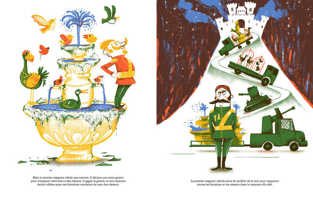 Leçons de philo. Tous les jours, les gens font la queue pour poser des questions au vieux sage Osho Babanesh. Chaque fois, le philosophe a la réponse. Quand l'un demande si l'hiver va durer encore longtemps, le sage répond : « il va durer jusqu'au printemps. » Et le demandeur repart rasséréné... Pour illustrer trois questions centrales sur le bonheur, la guerre et la mort, Babanesh raconte des histoires. La première, sur l'argent qui ne fait pas le bonheur, et la dernière, sur la mort, sont drôles mais pas aussi loufoques et originales que celle sur la guerre. Un seigneur à la tête d'un royaume célèbre pour ses magnifiques jardins déclare la guerre à son voisin qui dirige un royaume reconnu, lui, pour ses belles fontaines. Le premier gagne et revient en vainqueur, chef à son tour d'un royaume aux plus belles fontaines. Hélas comme tous les hommes sont partis à la guerre, les jardins anciennement mirifiques de son royaume sont de plus en plus mal entretenus. Mais l'absurdité de la guerre ne s'arrête pas en si bon chemin. Voilà maintenant que le seigneur vaincu à qui on a pris toutes ses belles fontaines a eu l'idée de les remplacer par de beaux oiseaux. L'acte ne manque pas d'exciter la corde belliqueuse de son voisin qui, jaloux comme un pou, déterre à nouveau la hache de guerre. On rit de la bêtise des personnages créés par Davide Cali pour dénoncer l'ineptie de toute guerre. L'illustration fine de Lionel Tarchala, pleine d'humour et de jolies couleurs, décuple encore notre plaisir à lire cet album.