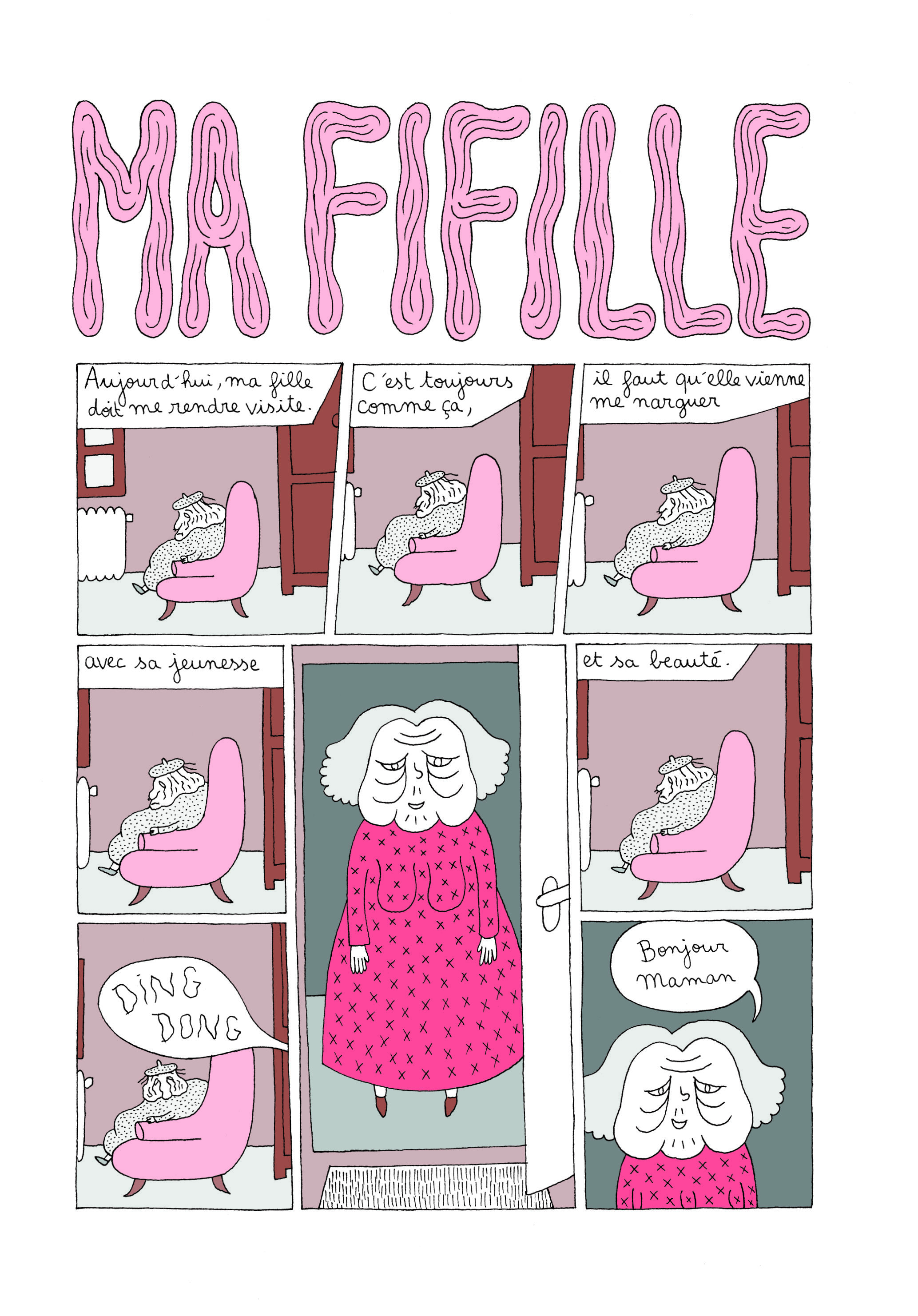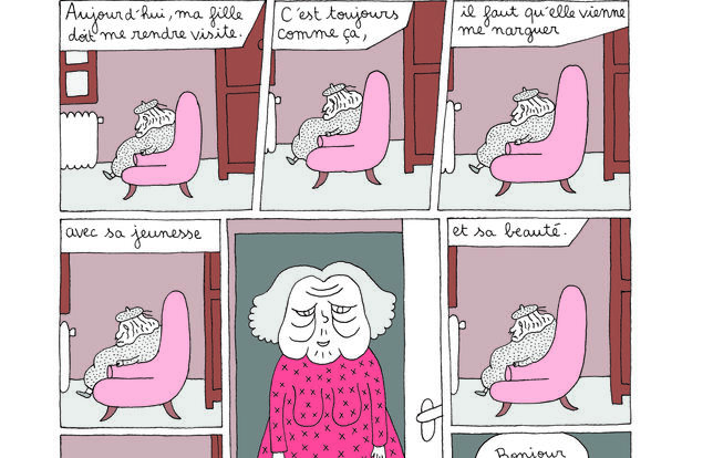 Surtout, l'autrice, grâce à son sens de la poésie entre absurde et fantaisie, confère à sa créature des pensées plus oniriques, plus philosophiques. Visitant une grotte, la vieille dame compare les concrétions à son apparence déliquescente - planches où, par ailleurs, le dessin minimaliste et abstrait de Delphine Panique s'exprime au mieux. Quand elle s'imagine sa mort prochaine, c'est façon Mort à Venise ou La ballade de Narayama. Elle évoque « une brume [...] propice à la rêverie » qui commence à envahir sa tête. Confus, étiolés, ses souvenirs s'y mélangent.