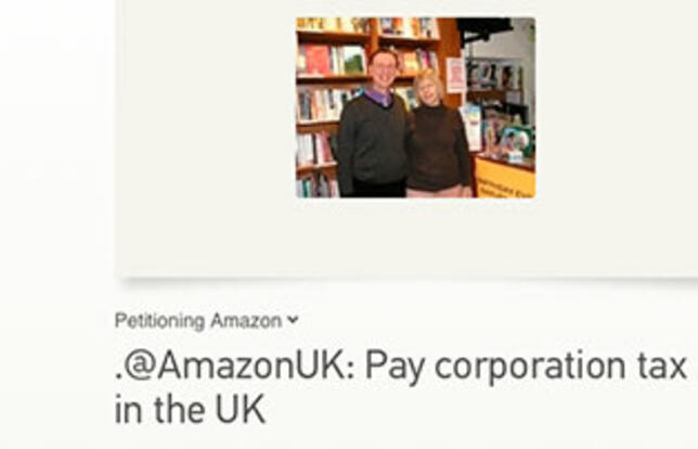 Soutenus par la présidente de la Commission des comptes publics britanniques Margaret Hodge, les libraires Frances and Keith Smith se préparent à remettre une pétition de 96000 signatures à ce jour à David Cameron, nommée «@AmazonUK: Pay corporation tax in the UK», c'est-à-dire «Amazon au Royaume-Uni: payez l'impôt sur les sociétés au Royaume-Uni.»