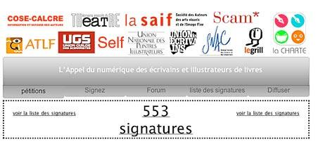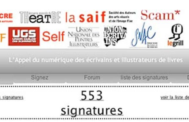 http://jesigne.fr/petition-appeldunumerique), le Syndicat national des auteurs et compositeurs (Snac), la Société civile des auteurs multimédia (Scam), la Charte des auteurs et illustrateurs jeunesse, Cose Calcre, l'Union des écrivains, Ecrivains associés du théâtre (EAT), l'Association des traducteurs littéraires de France (ATLF), l'Union guilde des scénaristes (UGS), l'Union nationale des peintres et illustrateurs (UNPI), la Société des auteurs des arts visuels et de l'image fixe (SAIF) et le Syndicat des écrivains de langue française (Self)