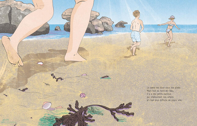 Sur une plage, six enfants se retrouvent chaque été. C'est le temps des copains et de l'aventure, celui où la glace coule sur les doigts tout collants et où le temps s'étire avec langueur. Pour la méga partie de cache-cache qui s'annonce, pas question de garder son vrai nom. Irène s'appellera Murène, Hippolyte, Hippocampe et Bruno, Bulot, etc. Mais déjà le groupe se scinde en deux. Après avoir exploré le blockhaus, le clan de Murène escalade de gros rochers gris. De l'autre côté, une surprise les attend : un immense château de sable habité par de drôles de personnages à tête de méduse, raie ou merlu. Bienvenue au royaume des sables et des eaux salées ! La reine du lieu, une gigantesque pieuvre, leur fait les honneurs de son thé aux algues puis de son musée aux curiosités où trônent les plus beaux spécimens de déchets humains, masque sanitaire, gant orphelin, bouteille de Coca toute cabossée et même vieux pneu en caoutchouc. Mais il est bientôt l'heure de rentrer : la marée monte dangereusement. Quand Murène et sa bande rejoignent leurs amis sur la plage, ceux-ci boudent salement... Pas de problème ! Il suffit pour se faire pardonner de dévoiler la cause du retard derrière les rochers. Mais arrivés sur place, surprise... Le royaume des sables a entièrement disparu. Dans son récit nimbé de fantastique, Élodie Bouédec mêle sans cesse imaginaire et réalité. Son illustration aux douces teintes pastel, où le sable constitue le principal outil graphique, achève de nous charmer.