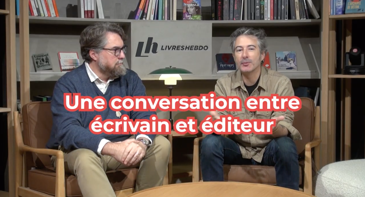 David Meulemans, fondateur des éditions Les Forges de Vulcain, et Gilles Marchand, auteur à succès, dans le studio de Livres Hebdo - Photo Livres Hebdo
