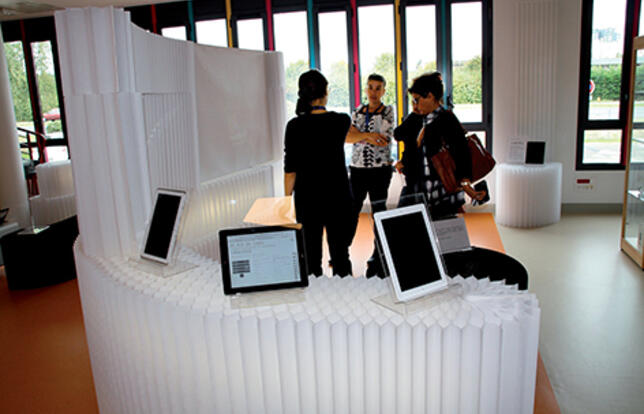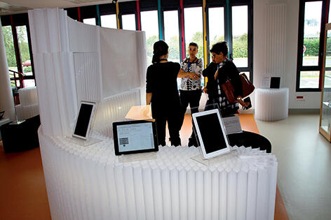L’espace "labo", en particulier, présente à tour de rôle différents dispositifs interactifs destinés à mettre en avant des thématiques spécifiques, installés in situ dans un esprit "showroom". Commandés à des designers, des graphistes ou des scénographes, ces modules innovants, conçus spécifiquement pour la médiathèque pour un budget d’environ 10 000 euros chacun, comprennent du mobilier modulable, tablettes, rayonnages, sièges, consoles, etc., permettant d’exposer les livres, de s’asseoir pour les lire ou encore de consulter des ressources numériques, selon les projets. Le module "De plis en code", par exemple, est dédié à la littérature numérique, tandis que "A petits pas" valorise les livres pour la petite enfance. "Nous nous sommes inspirés de la mise en scène des collections à la médiathèque du Val d’Europe et de ce que font les musées, très en avance sur les bibliothèques pour la médiation", explique Anne-Sophie Reydy, directrice de la médiathèque départementale. Les bibliothécaires en visite perçoivent ainsi facilement l’utilisation qu’ils pourraient faire dans leurs établissements de ces installations, empruntables pour plusieurs semaines et pouvant être déployées entièrement ou partiellement.