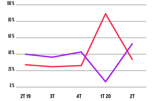 Décrochant en mars, les ventes de livres ont chuté sur l'ensemble du 2e trimestre 2020, de 18,5 % en euros courants à un an d'intervalle. Compte tenu de l'évolution de l'indice Insee des prix des livres, le décrochage s'inscrit à - 19 % en volume.