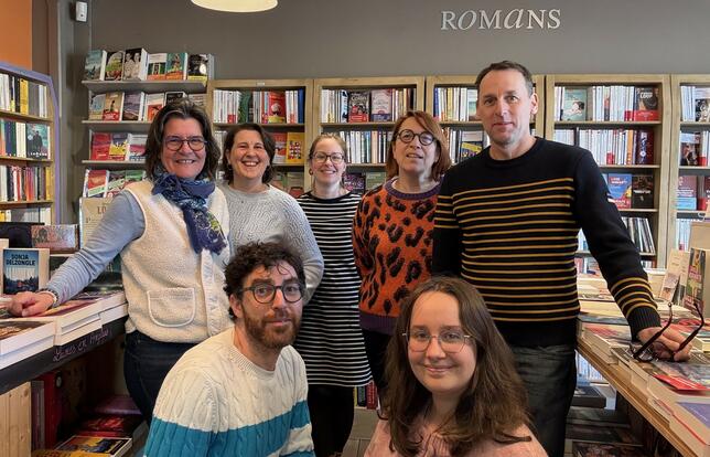 Devant la librairie : Karine, Clémence, Laurent, Cécile, Jonathan, Claire, Clémence- Photo LIBRAIRIE LE CHAT PITREPour télécharger ce document, vous devez d'abord acheter l'article correspondant.