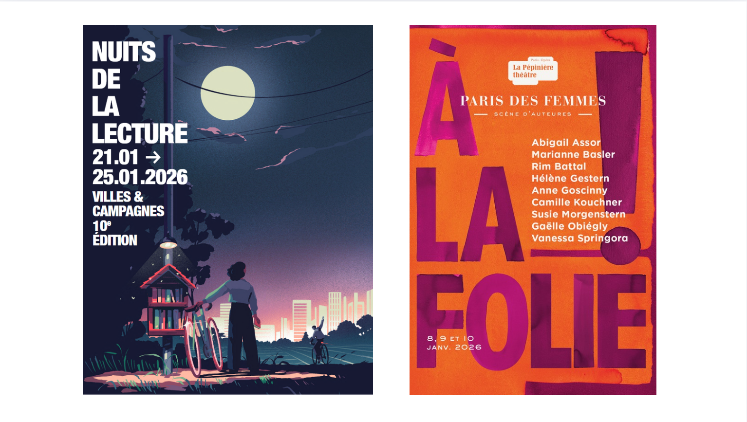 - 10e édition des Nuits de la lecture, du 21 au 25 janvier 2026 partout en France. Organisé par le Centre national du livre sur proposition du ministère de la Culture, cet événement célèbre le plaisir de lire à travers des milliers de manifestations physiques et numériques. Pour cette édition anniversaire, le public est invité à explorer le thème « Villes et campagnes » : des territoires qui s'opposent et se répondent dans la littérature, du roman du XIXe siècle à la science-fiction contemporaine, en passant par les questionnements actuels sur la transition écologique. L'affiche 2026 est signée par l'illustrateur Tom Haugomat. Marie-Hélène Lafon (Prix Renaudot 2020) et Laurent Gaudé (prix Goncourt 2004) seront respectivement marraine et parrain de cette édition. Temps fort : une soirée littéraire et festive le 23 janvier à Ground Control (Paris) avec table ronde, performance croisée lecture-musique (Simon Johannin et Molécule) et DJ set. Plus d’informations ici.