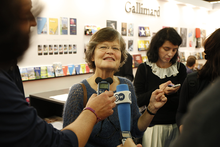 Anne Solange Noble, directrice des droits étrangers chez Gallimard, commente à chaud, jeudi 9 octobre, l’attribution du prix Nobel de littérature à Patrick Modiano. - Olivier Dion