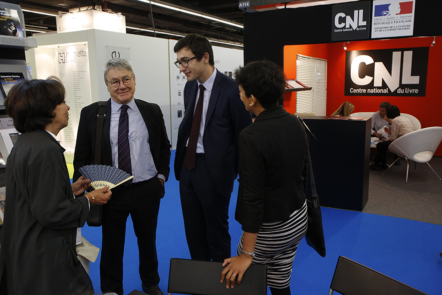 Liana Levi, Jean Guy Boin (Bief), Thibault Lacarièrre, le nouveau conseiller pour le livre auprès de la ministre de la Culture, et Aurélie Latchimy du CNL. - Olivier Dion