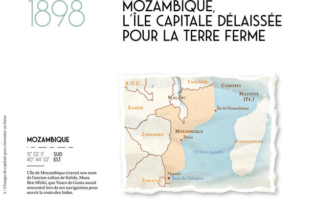 Il y a aussi des histoires plus saugrenues, comme celle de Mafeking, ex-capitale du protectorat britannique du Bechuanaland, située en dehors de ses frontières, en Afrique du Sud ! En 1965, lors de l'indépendance du pays devenu le Botswana, c'est Gaborone, au cœur du territoire, qui fut choisie comme capitale. Citons aussi Mombasa, port antique fondé par les Arabes, conquis par les Portugais puis tombé aux mains des Anglais, capitale de l'Afrique orientale britannique jusqu'à ce qu'en 1905 on lui préfère Nairobi, parce que la ville nouvelle était un hub ferroviaire.