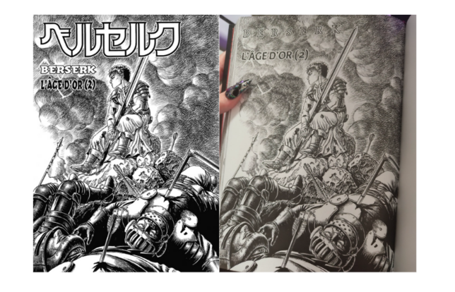 Les lecteurs du manga Berserk ont eu la mauvaise surprise de découvrir une erreur sur l’une des illustrations de Guts, protagoniste de l’œuvre. La lourde épée du héros ne possède pas de pommeau mais bien deux lames à ses extrémités. Le visuel original comportait un logo japonais qui masquait une partie importante de l’arme. Il a été retiré pour une meilleure visibilité, mais avec une incohérence de taille.
