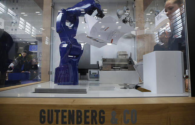 Gutenberg One est fabriqué en France. Aujourd’hui, un premier robot-imprimeur a été mis en service, dans les locaux parisiens de la librairie L’Harmattan, devenue la première « Librairie.one » de France, qui le propose à ses clients depuis la fin du mois de septembre.