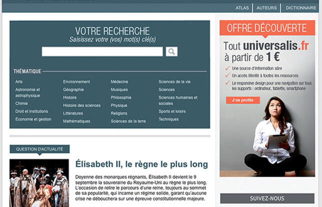 La moitié environ vient de la vente par correspondance du DVD de l’EU (13 000 exemplaires) et des éditions annuelles d’Universalia et de La science au présent, synthèses extraites de la base encyclopédique des événements de l’année. L’autre source de recette est purement numérique, et vient des abonnements des lycées et des universités à la base numérique de l’EU en France et dans les marchés francophones (Canada, Belgique, Suisse romande).