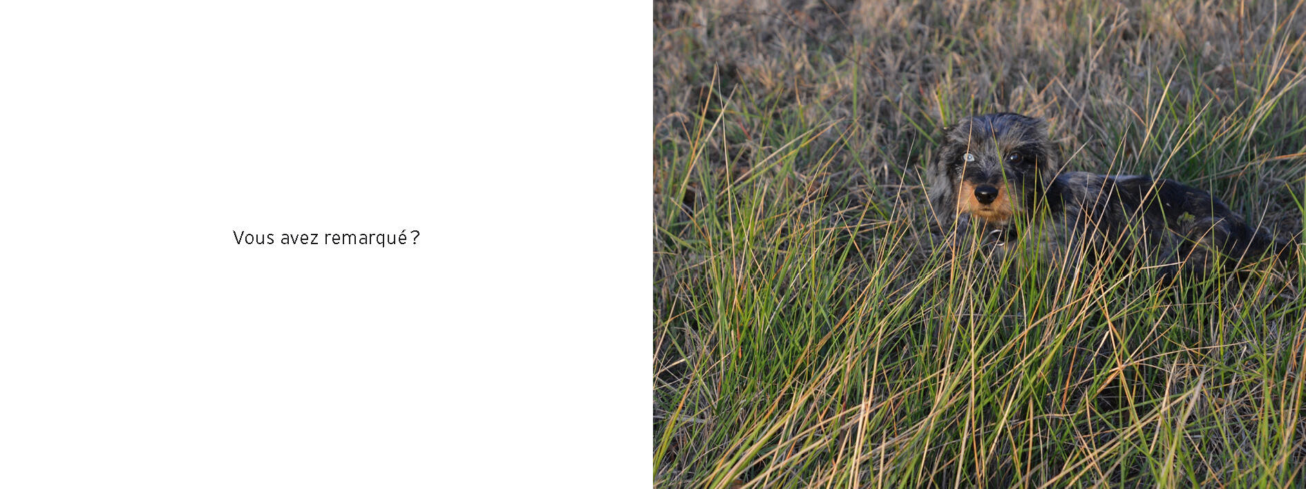 Drôle d'album pour un drôle de chien ! À la manière d'un photoroman des années 1950, Julien Baer nous parle de son chien Piloti. Sur la page de gauche une photographie, où le jeune lecteur peut exercer son sens de l'observation, le montre sous toutes les coutures et dans tous les décors. Et sur la page de droite un court texte interroge la relation du maître avec son fidèle ami. Il faut dire que Piloti est à croquer et qu'il ne ressemble à aucun autre avec son œil bleu et son œil brun, façon David Bowie. Quand il apparaît sur fond de feuillages sombres, on le voit à peine, il est plus camouflé qu'un char militaire, son pelage hirsute se confond avec la masse de la haie. Quand il se balade au bord de mer, là où l'eau est ourlée d'écume, on jurerait qu'il a légèrement la trouille d'aller plus avant, tant sa façon de poser une patte dans l'inconnu liquide est peu sûre. Sur les tommettes en terre cuite rouge, il a l'air tout penaud et pensif. Sur son tapis aux motifs de couleur, cette fois, c'est certain, il a des sentiments au même titre que moi. Au fond, qui est vraiment Piloti ?, nous demande cet album qui assène mine de rien une leçon de philosophie tout en douceur. Piloti ressent-il tendresse et empathie pour moi, autant que j'en ressens pour lui ? « Il n'est pas de ma famille, ce n'est pas mon cousin », conclut pourtant Julien Baer en faux candide. « Soyons raisonnable, Piloti est un chien, pas un être humain. » Avant de reculer et de trancher tout en coupant la poire en deux : « Piloti est un être teckel et moi, un humain nain. » À méditer...