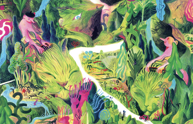 Un secret oublié. Kate s'amuse beaucoup avec son amie Anna. Mais quand celle-ci est sur le point de lui murmurer un secret à l'oreille, zut !, la maman de Kate l'entraîne dans un bus. Il est temps de rentrer ! La frustration ne s'arrête pas en si bon chemin. Le lendemain, mère et fille partent toutes deux pour un long et merveilleux voyage qui risque d'éloigner à tout jamais la perspective de la révélation d'Anna. Au début, Kate demande à ce qui l'entoure, rochers, vagues, arbres, s'ils ont eu vent du fameux secret. Mais peu à peu, le voyage devient si palpitant qu'il embarque corps et âme la fillette. Il faut dire qu'il y a de quoi. Chez Katerina Voronina, les montagnes sont poilues, plongent dans l'eau et de grosses mains vertes sortent de la voiture pour aller les caresser. De même, le palais où vécut jadis un mystérieux roi se transforme lui aussi sous l'œil fécond de Kate. Bref, d'étape en étape, la petite n'a plus du tout envie de rentrer. Elle qui traînait les pieds pour partir au début ! Et le secret d'Anna ? Un secret ? Quel secret ? Sur fond d'histoire mignonne et rigolote, la peintre murale d'origine moscovite Katerina Voronina livre des illustrations merveilleuses et chamarrées, qui font claquer leurs couleurs joyeuses, vert pomme et rose indien. Des planches sacrément habitées, aussi vivantes que vibrantes. Fabuleuses au sens propre, car dans le dessin on reconnaît ici une tête de chat dans la végétation, là un drôle de bonhomme couché dans l'herbe. Dans cet album, couleur, courbe et mouvement sont à la fête !