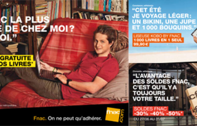 En affichage presse et digital, en magasin, dans les supports relationnels et sur les réseaux sociaux, la Fnac met en scène ses adhérents pour valoriser les services associés à sa carte et pour communiquer sur ses innovations : vente d'électro-ménager ou encore ouverture d'un magasin à Bercy village, à Paris, le 29 juin.