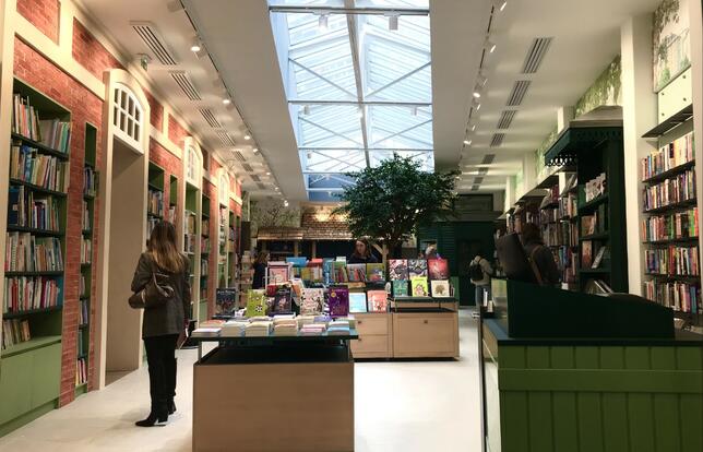 À l’intérieur, l’odeur de la peinture fraîche se mêle à celle du papier. La bande dessinée occupe les premiers rangs de la vitrine, l’offre adulte a rejoint de nouvelles étagères, à l'entrée de la boutique. Grâce aux travaux, la librairie a gagné quelques mètres carrés, 400 au total, étalés tout en longueur, comme « une invitation à la promenade, un clin d’œil au jardin du Luxembourg, à deux pas de là », confie Alexandra Flacsu, directrice du réseau Chantelivre. D’où la création d’une ambiance bucolique singularisée par une dominante vert pastel, une nouvelle verrière au plafond, un tronc d’arbre à mi-parcours, un kiosque, une cabane en bois et même une fresque des toits de Paris en fleurs, signée Juliette Lagrange, illustratrice de Hulotte (Kaléidoscope).