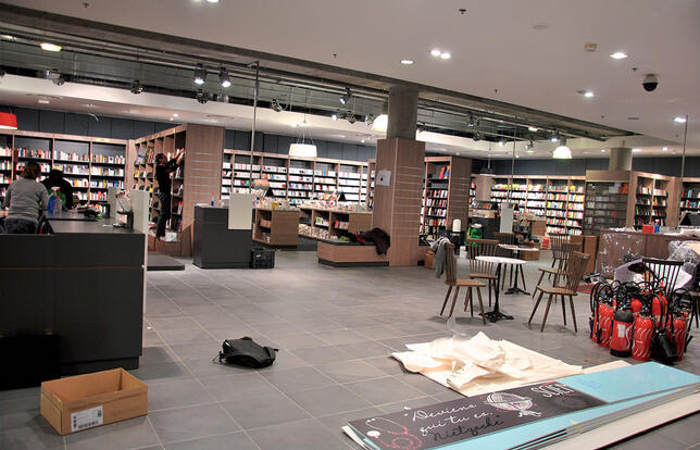 Déplacé du quai Lamartine au centre commercial rennais de la Visitation, distants d’un peu plus de 500 mètres, le magasin garde sa taille, 1 300 m2, mais prend un réel coup de jeune. Le libraire a parfaitement su intégrer les nouvelles tendances à l’œuvre en librairie : fluidité de la circulation, visibilité et accessibilité de l’offre, volonté d’en faire un "troisième lieu" de vie. Le Forum du livre présente donc des allées spacieuses, un nombre de tables réduit pour privilégier la dissémination de sièges et, dès l’entrée du premier niveau, un "café littéraire" propice à la flânerie et aux rencontres. L’offre, 60 000 titres pour le moment, est répartie selon de grands univers : l’art de vivre et l’évasion pour les 250 m2 du rez-de-chaussée, où se trouvent également les caisses ; la fiction, les savoirs, les apprentissages, la jeunesse et l’image (beaux-arts et BD) sur les 1 000 m2 de l’étage, que complètent le matériel de beaux-arts et la papeterie. La signalétique a été particulièrement soignée et apporte une touche d’humour grâce notamment à de grandes frises présentant les univers, qui marient dessins et citations de grands auteurs. En jeunesse, un "arbre magique" permet de cueillir des livres et de diffuser des DVD, alors qu’un mur végétal, réalisé par une entreprise rennaise, habille l’escalier. La communication de la librairie a également subi un coup de fouet avec la mise en place d’une page Facebook, d’un site marchand adossé aux Libraires.fr et de deux blogs, dont l’un de lecteurs. S’appuyant sur ces outils, la campagne de promotion, très riche, qui accompagne l’ouverture propose notamment deux jeux concours, dont l’un en partenariat avec Le Livre de poche.