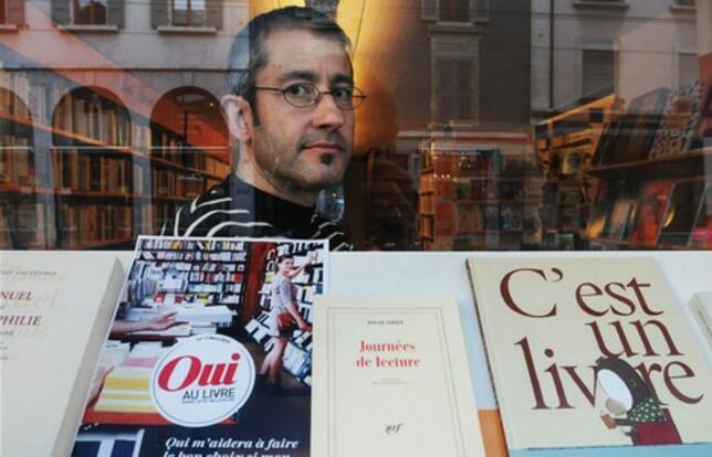 Marco Dogliotti dit « Oui au livre » dans sa vitrine de la librairie Le Parnasse, à Genève. - Photo OLIVIER DIONPour télécharger ce document, vous devez d'abord acheter l'article correspondant.