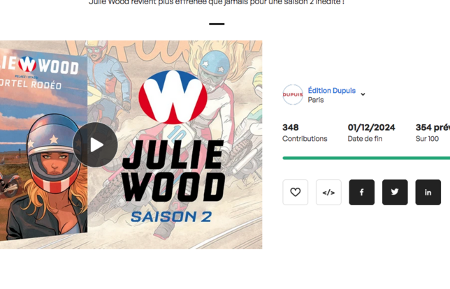 Dupuis a par exemple achevé le 1er décembre 2024 sa campagne de précommande pour une version collector du tome 1 de la saison 2 de Julie Wood, avec 348 contributeurs. L’édition courante arrivera quant à elle en librairie en février 2025. Autre exemple, Hoëbeke (Gallimard), a aussi mis un pied dans le financement participatif en juin 2024 via KissKissBankBank pour le « livre-photo féministe » Lusted Men.