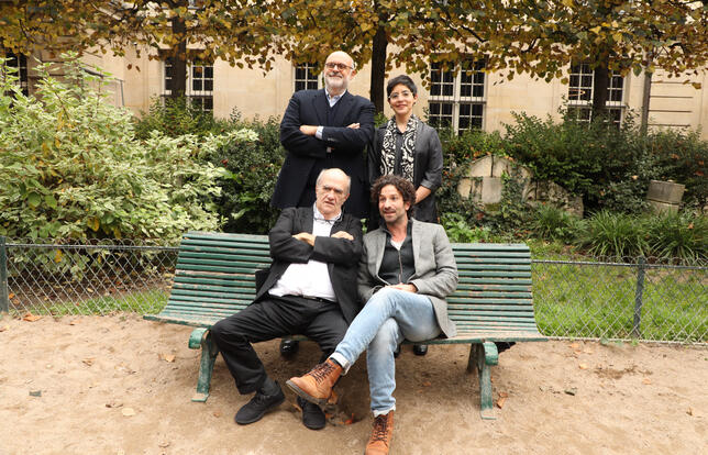 Paul Audi et Alia Trabucco Zerán (debout), Colm Tóibín et Miguel Bonnefoy (assis) réunis par le prix Femina 2024 - Photo Olivier Dion