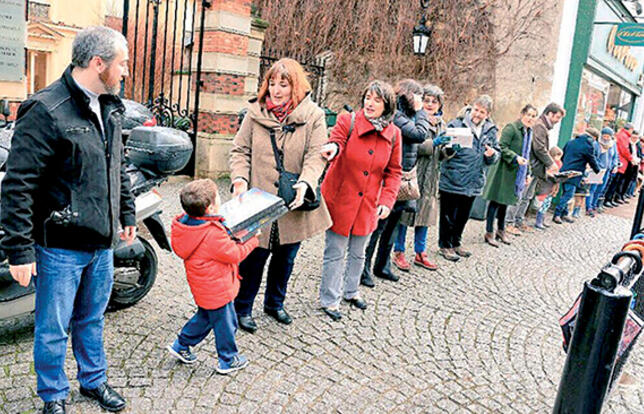 L’Eclectique, à Saint-Maur-des-Fossés, a déménagé au son de la cornemuse avec le soutien de nombreux clients qui ont constitué une chaîne humaine. - Photo Librairie l’Eclectique/Jean-claude Wierzba