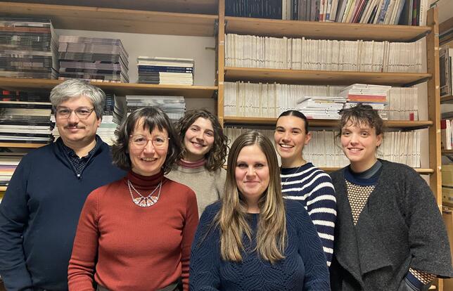 L'équipe des éditions Théâtrales, de gauche à droite : Pierre Banos, Gaëlle Mandrillon, Emma Otrzonsek, Mathilde Thiou, Lola Bourgeois, Mahaut Bouticourt. - Photo Hassan Bouhouch