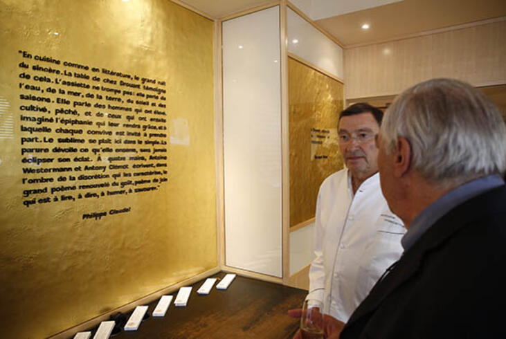Antoine Westermann, chef du restaurant Drouant, avec Didier Decoin devant la phrase de Philippe Claudel. - Olivier Dion