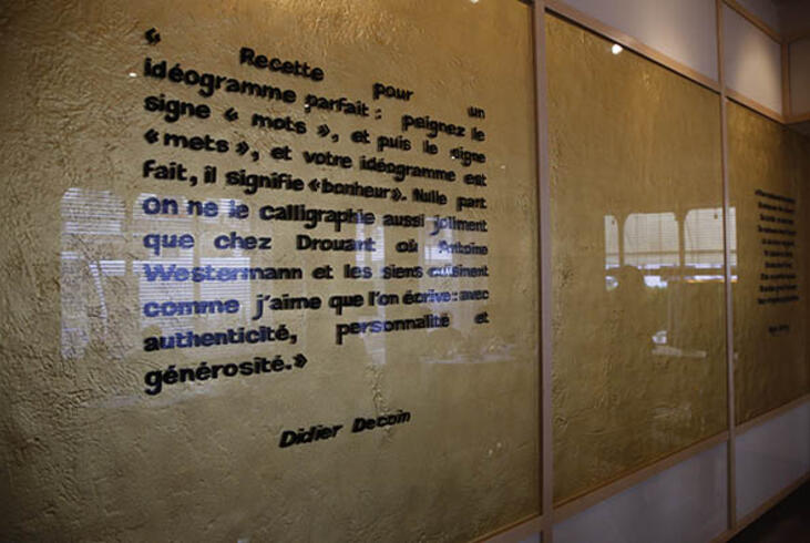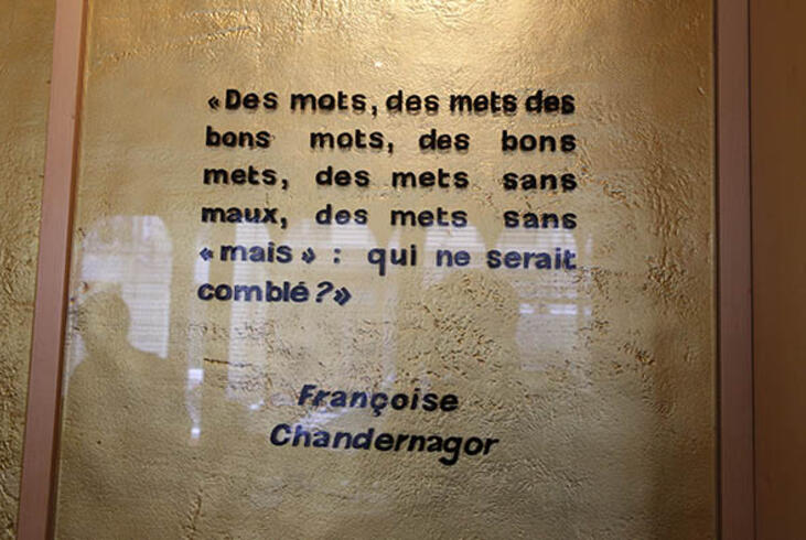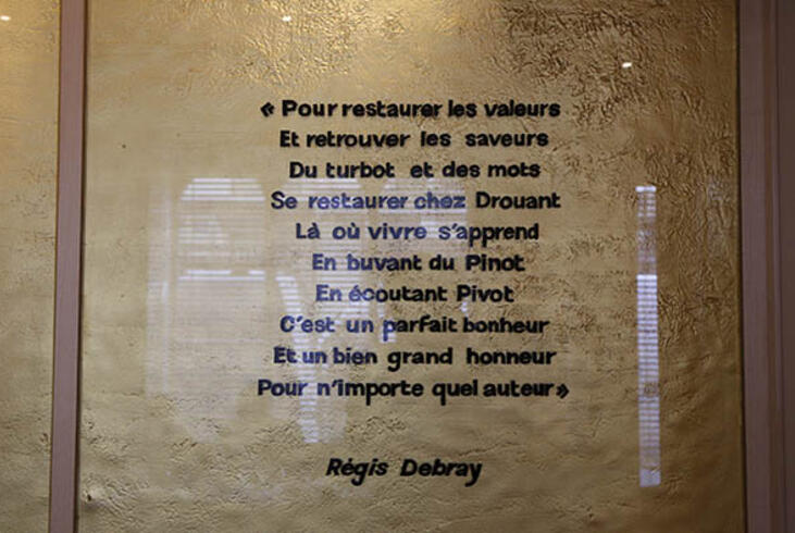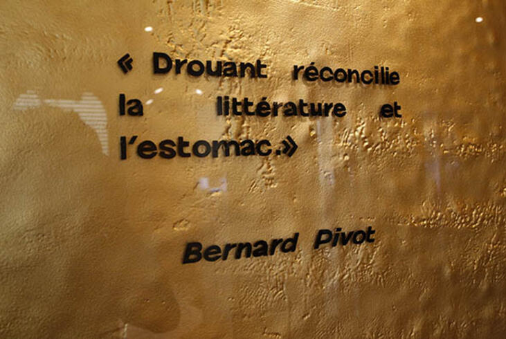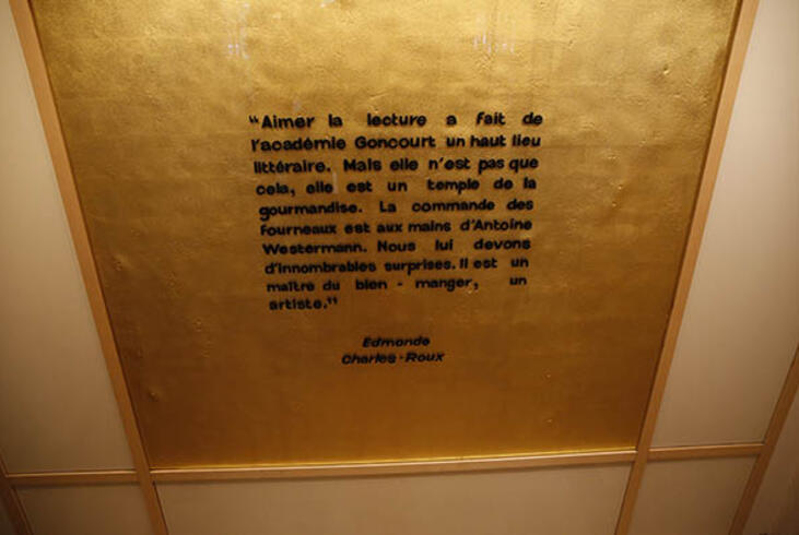 A l'entrée du restaurant Drouant, la phrase de la présidente d'honneur du prix Goncourt, Edmonde Charles-Roux. - Olivier Dion - La phrase de la présidente d'honneur du prix Goncourt
