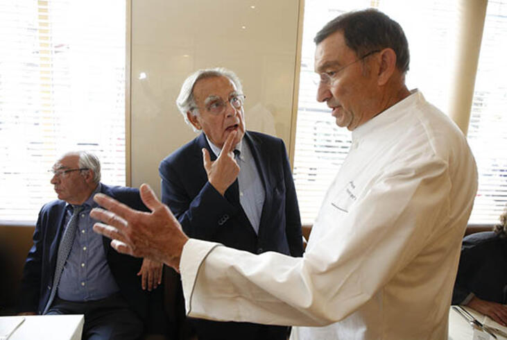 Les maîtres des lieux : Bernard Pivot, le président du prix Goncourt, avec Antoine Westermann, chef du restaurant Drouant, et, au fond, Didier Decoin, le secrétaire du prix. - Olivier Dion