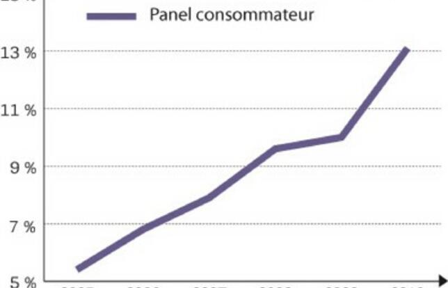 D'autre part, TNS-Sofres a dû suspendre pour des raisons de rentabilité le panel de consommateurs sur les achats mensuels de livres, dont le ministère de la Culture était resté le principal client. En 2010 (voir graphique), les achats sur Internet déclarés par les panélisés avaient atteint 13,1 %, englobant aussi les sites étrangers ou les non-spécialistes du livre, absents des enquêtes distributeurs. TNS-Sofres et le ministère ont repris une enquête sur les achats de livres moins détaillée et sur un rythme trimestriel, dont les données ne seront pas comparables.