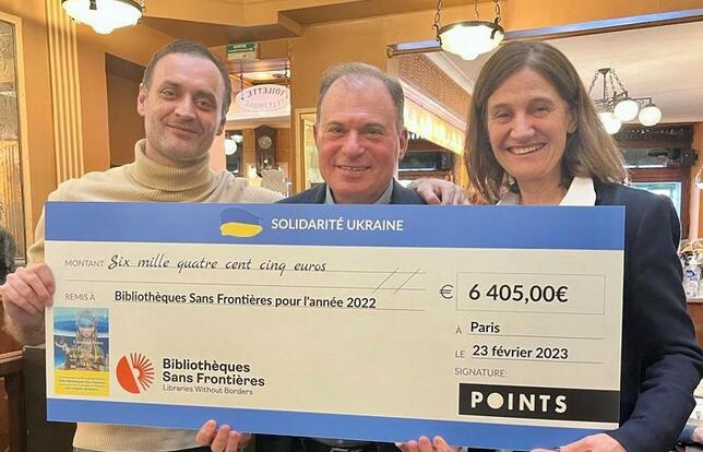 Depuis un an, l'ONG Bibliothèques Sans Frontières se mobilise pour l'Ukraine : création de dix médiathèques en kit Ideas Box en Ukraine, Moldavie et Pologne, « Microbibliothèques d'urgence» dans plusieurs pays d'Europe à l'attention des réfugiés... Le 23 février 2023, en gage de soutien, les éditions Points leur ont reversé un chèque de 6 405 €.