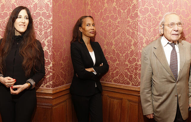 "Elle est forte, la lumière", dit Josyane Savigneau, la présidente du jury Décembre. "On est au théâtre", lui répond Jean-Michel Ribes, le directeur du théâtre du Rond-Point où était décerné le prix, le 6 novembre 2014.. - Olivier Dion