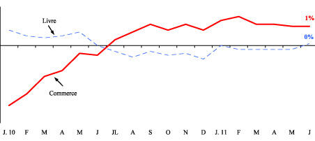 En juin, selon le baromètre mensuel I+C/Livres Hebdo, le marché du livre n'a progressé que de 1 % en euros courants par rapport à juin 2010 (qui comptait deux jours de semaine de plus). En mai, le marché avait stagné. Autre satisfaction relative, en juin le livre s'est mieux porté que l'ensemble du commerce de détail en baisse de 1%.
