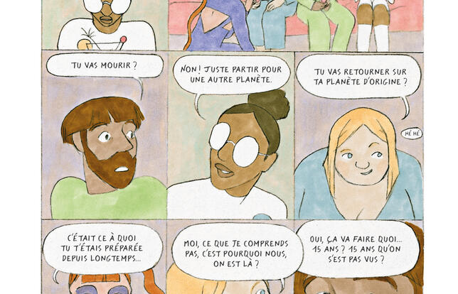 Sur le schéma classique du « on s'était dit rendez-vous dans dix ans », où les adultes se regardent dans les yeux à la lumière de leurs rêves d'adolescence évaporés, Lisa Blumen propose un petit théâtre tout en sensibilité, qui évite les grandes déclarations et les irruptions d'amertume qu'on pensait incontournables. Dans une mise en scène d'une belle variété, elle suggère d'abord l'étouffement, par des petites cases collées les unes aux autres. Puis, elle met ses acteurs en mouvement, s'appuie sur des cadrages subtils pour souligner des regards lourds de sens - mais jamais celui de Nova, toujours caché sous ses verres blancs - et des gestes précis, tendus, las ou tendres. Sous les encres colorées de l'autrice diplômée de la HEAR à Strasbourg, qui publie là seulement sa seconde bande dessinée après Avant l'oubli et plusieurs albums jeunesse, cette dernière soirée avant la fin d'un monde dépasse le constat fatigué de ces presque quadras sur leur vie - l'un souffre du regard des autres, l'autre de charge mentale, le troisième accompagne son père dépendant. Elle devient une touchante évocation de l'importance de l'amitié, à la conclusion rassérénante : « On a le droit de faire des erreurs, d'aller doucement. Et même de rater exceptionnellement bien sa vie. Ce qui est grave, c'est de s'enfermer dans une fusée pour ne pas avoir à la vivre. » Un album d'une belle maturité, dans le fond comme dans la forme, lumineuse et d'une rare finesse.