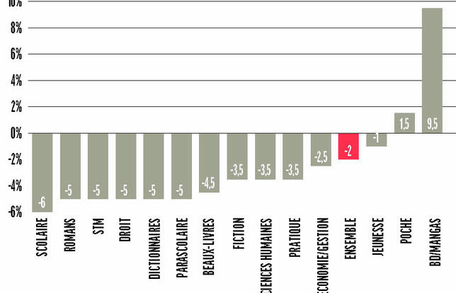 Tous les rayons accusent le coup cette année après des performances exceptionnelles en 2021. Tous ? Non ! Deux secteurs résistent encore et toujours à la décroissance : celui du manga/BD, avec +9,5 % par rapport à une année 2021 déjà explosive (+34 %). Comme un symbole, le titre le plus vendu en France tout rayon confondu est la BD Un monde sans fin (Dargaud). Le poche (+1,5 %) échappe aussi au retournement de situation.