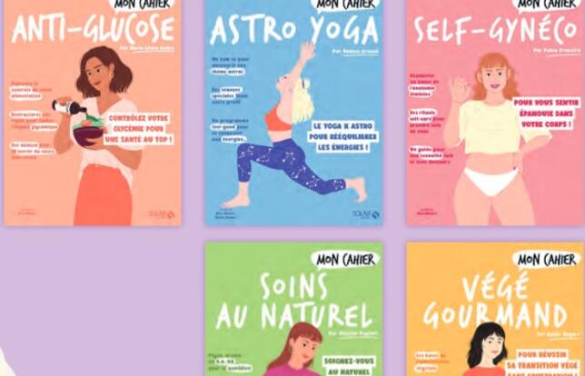 L'éditeur de livres illustrés et pratiques Solar renouvelle sa collection consacrée au bien-être féminin « Mon cahier », à l'occasion de ses dix ans : nouvelle maquette, nouvelles illustrations, pagination augmentée... Six titres paraîtront le 7 septembre 2023 dans cette nouvelle formule : Anti-glucose, Yoga antistress, Soins au naturel, Végé gourmand, Astro yoga et Self-gynéco.