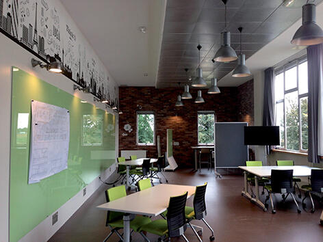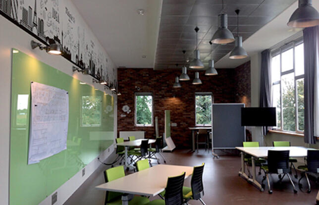Le réaménagement de la bibliothèque, dirigé par l’architecte Françoise Sogno et préparé en concertation avec les étudiants et les enseignants, avait pour lignes directrices de créer des espaces plus conviviaux et de favoriser les nouveaux modes d’apprentissage. Le plateau de 700 m2 dédié au public a été divisé en trois zones : un coin détente avec des chauffeuses, une zone de travail silencieuse à proximité des collections, réduites de 45 000 à 18 000 documents en accès libre, et une zone de coworking. Cette dernière compte plusieurs salles de travail en petits groupes et un espace "lab" avec un mur inscriptible, des tableaux interactifs, du mobilier modulable ainsi que des cloisons mobiles pour organiser l’espace. Une importante connectique est présente partout. La bibliothèque s’est également dotée d’un studio d’enregistrement. L’impact de la nouvelle formule ne s’est pas fait attendre : la fréquentation a été multipliée par quatre depuis la rentrée. "La plupart des étudiants vivent sur le campus, relève Agnès Melot, directrice de la bibliothèque. Et 61 % d’entre eux sont étrangers. Ils ont l’habitude de ce type de services en bibliothèque."