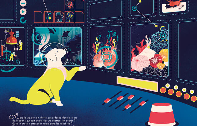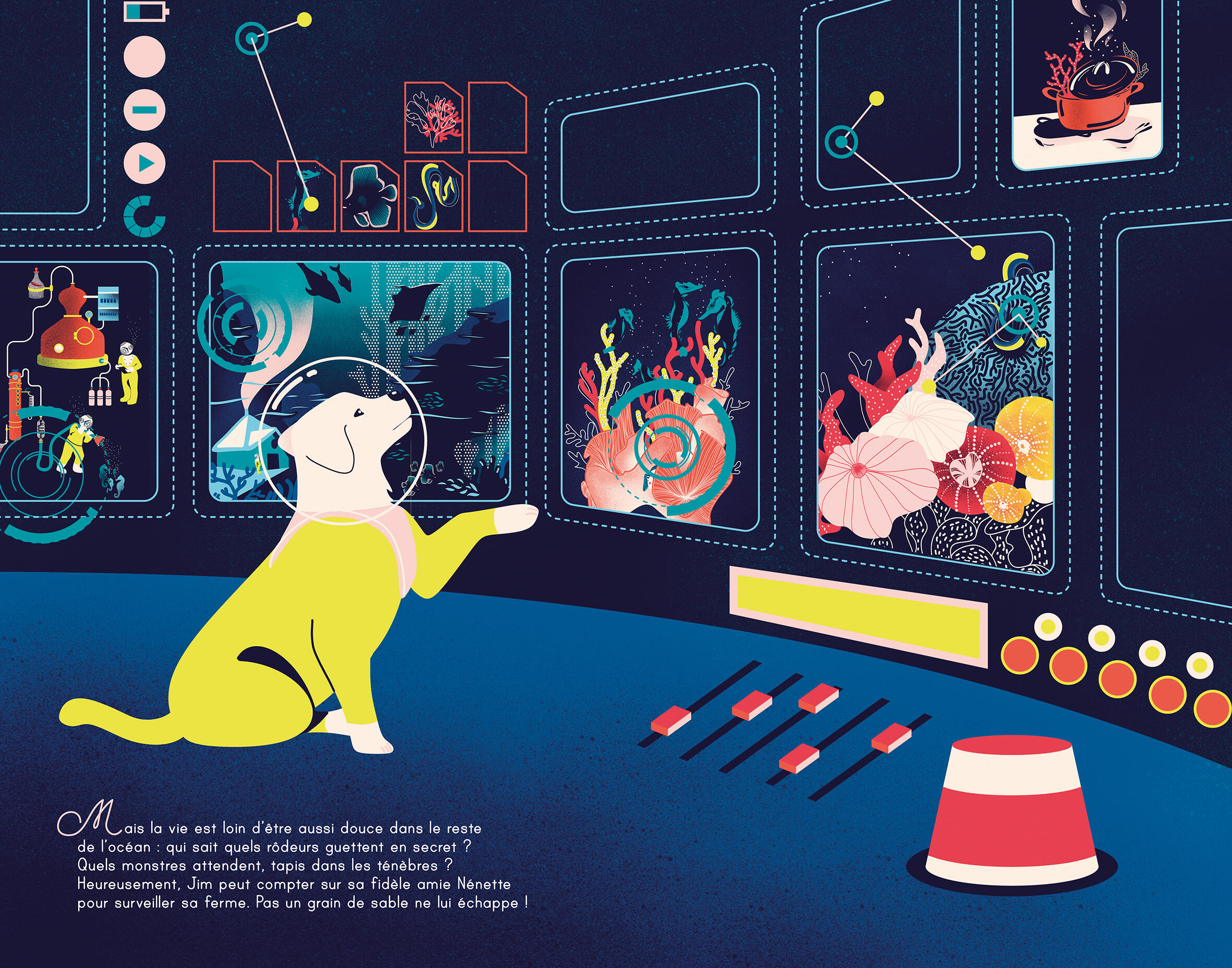 Plutôt du genre renfermé, Jim vit en autarcie derrière les barbelés de sa belle ferme marine loin des êtres humains. Grâce aux légumes sains et nourrissants qu'il cultive dans son coin de paradis, exit les prédateurs ! Plus personne ne mange personne et tout le petit peuple recueilli à la ferme - murènes, anémones et crevettes - vit en paix et en harmonie. Sa fidèle chienne Nénette est chargée de contrôler radars et écrans de surveillance afin d'empêcher toute intrusion extérieure. Tout va bien dans le meilleur des mondes jusqu'à ce qu'un soir le son strident d'une sirène d'alarme retentisse, alors que le bon Jim est tranquillement en train de lire La Dépêche de l'Océan avec Nénette à ses pieds. Alerte rouge ! Dans l'écran du poste de surveillance se profile un monstre menaçant. Un énorme cachalot bardé de cicatrices est pris dans les barbelés de la clôture ! Le géant des mers parvient enfin à se dégager, mais d'un puissant coup de queue il projette Jim loin, très loin dans les profondeurs abyssales et obscures. Au fond du gouffre noir, éclairés par l'éclairage de sa combinaison, apparaissent alors une multitude d'êtres féeriques. D'abord effrayé par l'inconnu, Jim finira par y tisser de nouvelles et solides amitiés. De retour de son prodigieux périple, il change radicalement de vision du monde. La meilleure preuve et la métamorphose de sa petite ferme recluse en « auberge des amis » ouverte sur l'extérieur et les autres. Cette belle allégorie sur la nécessité et la douceur du vivre-ensemble est née de l'imagination d'un couple, Claire et Hugo Zaorski. Fabienne Jacob