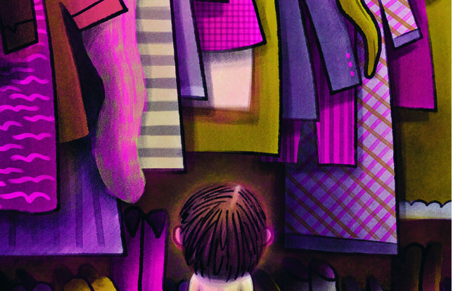 De l'autre côté du dressing, c'est une autre paire de manches ! Les tenues de maman sont colorées et gaies. Cintrées, amples, longues, courtes, jupes et robes ont des formes variées qui stimulent l'imaginaire. Il se choisit une tunique, un foulard et des chaussures. Et cette fois le résultat est seyant et probant. Un petit tour au coffre à bijoux et à la trousse de maquillage, et hop ! il est fin prêt pour parader devant ses parents dans ses nouveaux atours. Au salon, devant eux, il se taille un franc succès. Non seulement ils apprécient sa tenue mais l'encouragent à aller plus loin. Gageons que cet album va en agacer certains et en ravir d'autres.