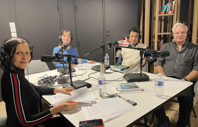 L'équipe de Livres Hebdo en compagnie d'Alain Nicolas, journaliste à L'Humanité, dans le studio des Voix du livre - Photo Livres Hebdo